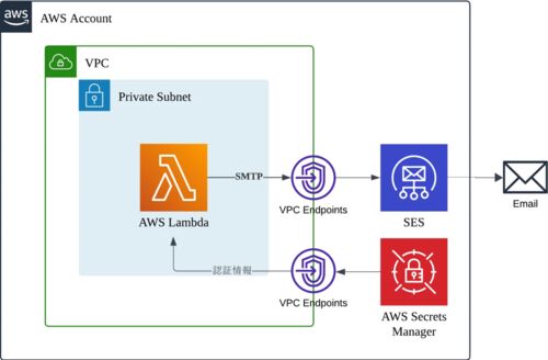 構成 プライベートサブネット内で起動したlambda関数から、インターネットを経由せずSESを呼び出そうと思います。 本記事では以下の構成でlambda関数からSESを呼び出します。 acrhitecture 本文中コード. github.com lambdaからSESにアクセスする手段 プライ…